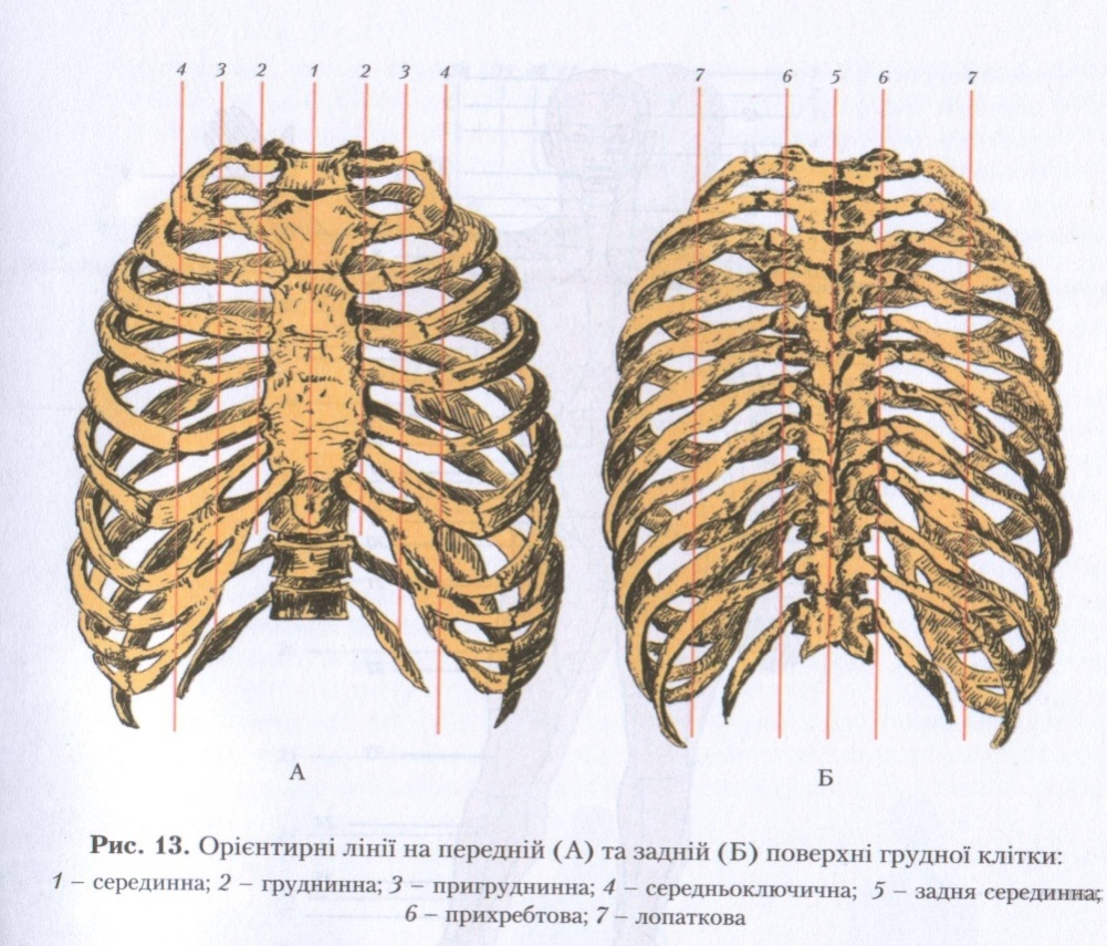 1 – linea mediana anterior, передняя срединная линия; 2 – linea sternalis, грудинная линия; 3 – linea parasternalis, окологрудинная линия; 4 – linea medioclavicularis, среднеключичная линия; 5 – linea mediana posterior, задняя срединная линия; 6 – linea paravertebralis, околопозвоночная линия; 7 – linea scapularis, лопаточная линия.