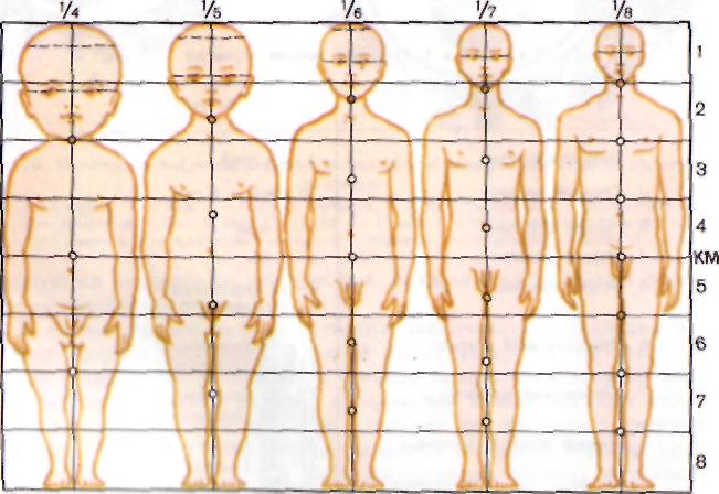 КМ – средняя линия; цифры сверху показывают, какую часть тела составляет голова; деления, отмеченные цифрами справа, – соответствие отделов тела детей и взрослых; цифры внизу – возраст.