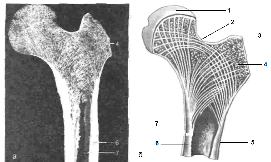 а – строение бедренной кости на распиле; б – перекладины губчатого вещества располагаются не беспорядочно, а закономерно; 1 – эпифиз; 2 – метафиз; 3 – апофиз; 4 – губчатое вещество; 5 – диафиз; 6 – компактное вещество; 7 – костномозговая полость.