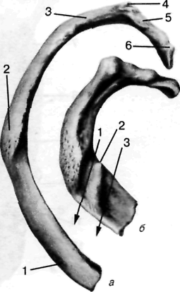 а: 1 – extremitas anterior; 2 – corpus costae; 3 – extremitas posterior; 4 – tuberculum costae; 5 – collum costae; 6 – caput costae; б: 1 – sulcus a. subclaviae; 2 – tuberculum m. scaleni anterioris; 3 – sulcus v. subclaviae