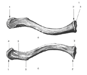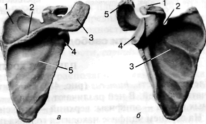 а – вид сзади: 1 – fossa supraspinata; 2 – spina scapulae; 3 – acromion; 4 – collum scapulae; 5 – fossa infraspinata; б – вид спереди: 1 – processus coracoideus; 2 – incisura scapulae; 3 – fossa subscapularis; 4 – cavilas glenoidalis; 5 – facies articularis acromialis.