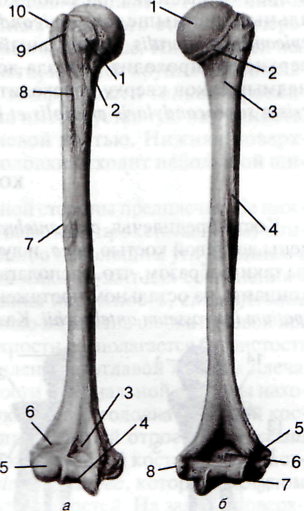а – вид спереди: 1 – tuberculum minus; 2 – crista tuberculi minoris; 3 – fossa coronoidea; 4 – trochlea humeri; 5 – capitulum humeri; 6 – fossa radialis; 7 – tuberositas deltoidea; 8 – crista tuberculi majoris; 9 – sulcus intertubercularis; 10 – tuberculum majus; б – вид сзади: 1 – caput humeri; 2 – collum anatomicum; 3 – collum chirurgicum; 4 – sulcus n. radialis; 5 – epicondylus lateralis; 6 – fossa olecrani; 7 – trochlea humeri; 8 – epicondylus medialis.