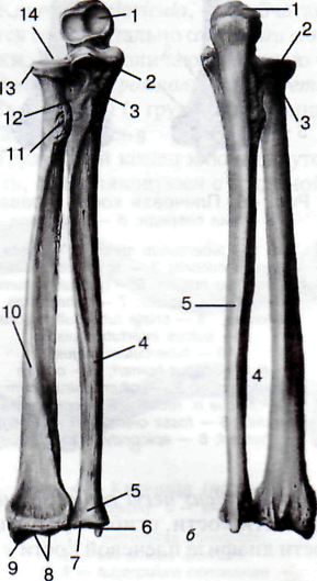 а – вид спереди: 1 – incisura trochlearis; 2 – processus coronoideus;3 – tuberositas ulnae; 4 – ulna; 5 – capuf ulnae; 6 – processus styloideus ulnae;7 – circumferentia articularis ulnae; 8 – facies articularis carpea; 9 – processus styloideus radii; 10 – radius; 11 – tuberositas radii; 12 – crista m. supinatores; 13 – caput radii; 14 – fovea articularis; б – вид сзади: 1 – olecranon; 2 – circumferentia articularis radii; 3 – collum radii; 4 – spatium interosseum; 5 – ulna.