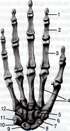 1 – phalanx distalis; 2 – phalanx media; 3 – phalanx proximalis; 4 – ossa metacarpalia; 5 – os trapezoideum; 6 – os trapezium; 7 – os capitatum; 8 – os scaphoideum; 9 – os lunatum; 10 – os triquetrum; 11 – os pisiforme; 12 – os hamatum.