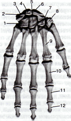 1 – os hamatum; 2 – os pisiforme; 3 – os triquetrum; 4 – os lunatum; 5 – os capitatum; 6 – os scaphoideum; 7 – os trapezoideum; 8 – os trapezium; 9 – os metacarpale; 10 – phalanx proximalis; 11 – phalanx media; 12 – phalanx distalis.