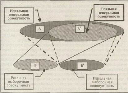 На схеме сплошной линией обозначена связь двух реальных выборок: А'=>В символизирует то, что получилось в эмпирическом исследовании в действительности. Хотя, конечно же, социологу мечталось о другом. В идеале он желал бы связь А=>В', т.е. чтобы из идеально сконструированной и максимально широкой генеральной совокупности у него получилась максимально полная и репрезентативная выборка. Но позже, когда он осознал невозможность идеальной генсовокупности, он устремился ко второму варианту — получить связь А'=>В', т.е. из ограниченной генсовокупности получить максимально полную выборку. На самом же деле, преодолев многочисленные трудности и наделав множество ошибок (случайных и систематических), социолог получил самый худший вариант, а именно А'=>В.