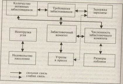 Теоретические связи, выстраивающиеся между так называемыми абстрактными объектами, имеют разный характер и разную силу Совершенно ясно, что связь между «забастовочным комитетом» и «требованиями забастовщиков» наиболее сильная, так как комитет, собственно говоря, инициирует и формулирует перечень требований. Он — мозговой центр, штаб забастовки. Именно здесь самые активные участники. Можно даже предположить (а на практике проверить наше предположение), что «численность забастовочного комитета» и «количество активных забастовщиков» в некоторых (либо в большинстве) типах забастовок совпадает.