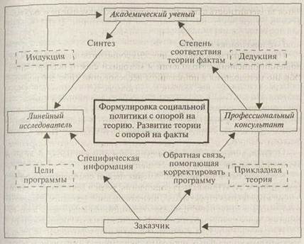 На схеме 6.1 показаны действительные взаимоотношения между заказчиками социальных программ, академическими учеными, линейными исследователями и консультантами. У каждого из них специфическая роль.