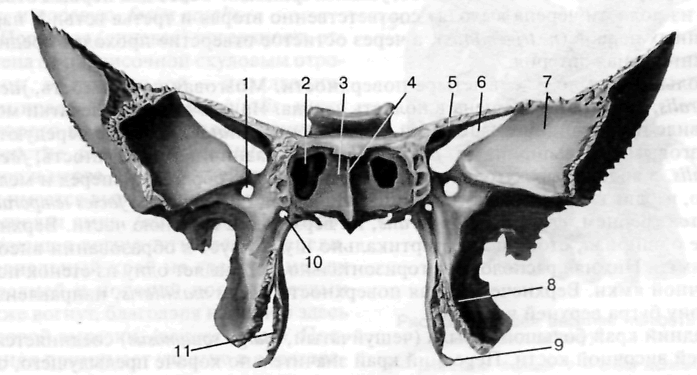 1 – foramen rotundum; 2 – apertura sinus sphenoidalis; 3 – concha sphenoidalis; 4 – crista sphenoidalis; 5 – ala minor; 6 – fissura orbitalis superior; 7 – ala major; 8 – lamina lateralis processus pterygoidei; 9 – hamulus pterygoideus; 10 – canalis pterygoideus; 11 – lamina medialis processus pterygoidei.