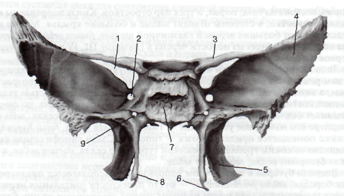 1 – fissura orbitalis superior; 2 – foramen rotundum; 3 – ala minor; 4 – ala major; 5 – lamina lateralis processus pterygoidei; 6 – hamulus pterygoideus; 7 – corpus; 8 – lamina medialis processus pterygoidei; 9 – canalis pterygoideus.