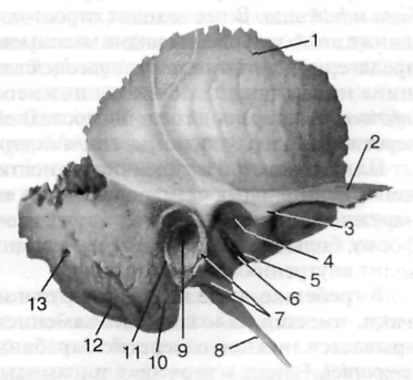 1 – squama temporalis; 2 – processus zygomaticus; 3 – tuberculum articulare; 4 – fossa mandibularis; 5 – fissura petrosquamosa; 6 – fissura petrotympanica; 7 – pars tympanica; 8 – processus styloideus; 9 – porus acusticus externus; 10 – processus mastoideus; 11 – fissura tympanomastoidea; 12 – incisura mastoidea; 13 – foramen mastoideum.