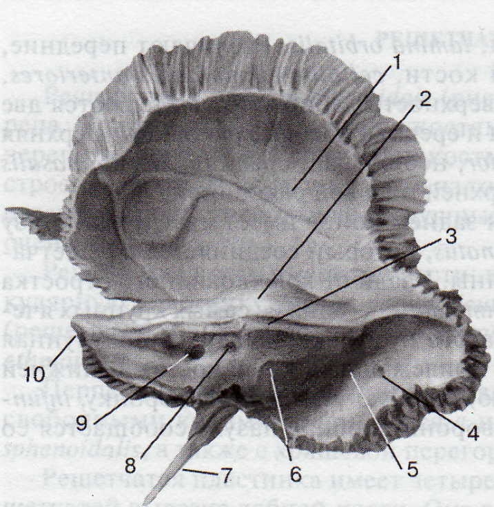 | Решетчатая кость, os ethmoidale | 1. Продырявленная (решетчатая) пластинка, lamina cribrosa; 2. Перпендикулярная пластинка, lamina perpendicularis; 3. Решетчатый лабиринт, labyrinthus ethmoidalis (парное образование) |