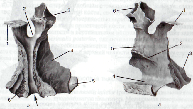 a: 1 – processus sphenoidalis; 2 – incisura sphenopalatina; 3 – processus orbitalis; 4 – lamina perpendicularis; 5 – lamina horizontalis; 6 – processus pyramidalis; стрелкой показана sulcus palatinus major; б: 1 – processus sphenoidalis; 2 – crista conchalis; 3 – processus pyramidalis; 4 – lamina horizontalis; 5 – lamina perpendicularis; 6 – processus orbitalis.
