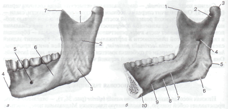 a: 1 – incisura mandibulae; 2 – ramus mandibulae; 3 – tuberositas masseterica; 4 – protuberantia mentalis; 5 – foramen mentale; 6 – corpus mandibulae; 7 – processus coronoideus; б: 1 – processus coronoideus; 2 – fovea pterygoidea; 3 – processus condylaris; 4 – foramen mandibulae; 5 – angulus mandibulae; 6 – tuberositas pterygoidea; 7 – linea mylohyoidea; 8 – fovea submandibularis; 9 – fovea sublingualis; 10 – fossa digastrica.