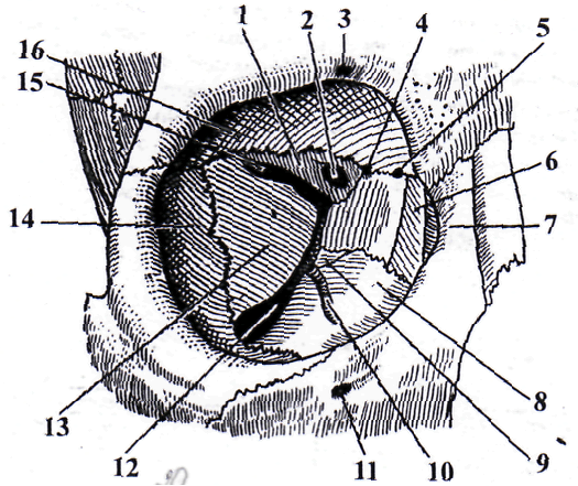 1 - ala minor ossis sphenoidalis; 2 - canalis opticus; 3 - for. supraorbitale; 4 - for. ethmoidale posterius; 5 - for. ethmoidale anterius; 6 - os lacrimale; 7 - processus frontalis maxillae; 8 - facies orbitalis maxillae; 9 - processus orbitalis ossis palatini; 10 - sulcus infarorbitalis; 11 - for. infraorbitale; 12 - fissura orbitalis inferior; 13 - ala major ossis shenoidalis; 14 - os zygomaticum; 15 - fissura orbitalis superior; 16 - pars orbitalis ossis frontalis.