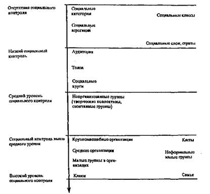 циях социальный контроль отсутствует, так как это чисто абстрактные выделения сообществ по одному признаку. Конечно, у индивидов, входящих в категорию, можно заметить определенную идентификацию с другими членами категории (например, по возрасту), но, повторяем, социальный контроль практически здесь отсутствует. Весьма низкий уровень контроля наблюдается в общностях, сформированных по принципу пространственной близости. Социальный контроль здесь происходит просто из сознания присутствия других индивидов. Затем социальный контроль усиливается по мере превращения квазигрупп в социальные группы.