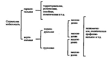 П. Сорокин различает два типа социальной мобильности: горизонтальную и вертикальную. Горизонтальная мобильность - это переход индивида или социального объекта от одной социальной позиции к другой, лежащей на том же уровне, например переход индивида из одной семьи и другую, из одной религиозной группы в другую, а также смена места жительства. Во всех этих случаях индивид не меняет социального слоя, к которому он принадлежит, или социального статуса. Но наиболее важным процессом является вертикальная мобильность, представляющая собой совокупность взаимодействий, способствующих переходу индивида или социального объекта из одного социального слоя в другой. Сюда входит, например, служебное повышение (профессиональная вертикальная мобильность), существенное улучшение благосостояния (экономическая вертикальная мобильность), или переход в более высокий социальный слой, на другой уровень власти (политически вертикальная мобильность).