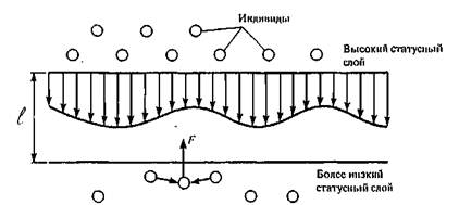 Для того чтобы достичь более высокого статуса, индивид, находящийся в группе с более низкими статусами, должен преодолеть барьеры между группами или слоями. Эти барьеры на рис. 13 представлены как силы, отталкивающие индивидов низшего слоя (природа этих сил многообразна и представлена в основном субкультурными нормами и запретами). Индивид, стремящийся попасть в более высокую статусную группу, имеет определенную энергию, направленную на преодоление этих барьеров и расходующуюся на прохождение расстояния " l " между статусами более высокой и более низкой группы. Энергия индивида, стремящегося к более высокому статусу, находит выражение в силе "F", с которой он пытается преодолеть барьеры перед высшим слоем. Удачное прохождение барьера возможно только в том случае, если сила, с которой индивид стремится достичь высокого статуса, будет больше силы отталкивания. В соответствии с теорией поля сила, с которой индивид может пробиваться в верхний слой, равна: