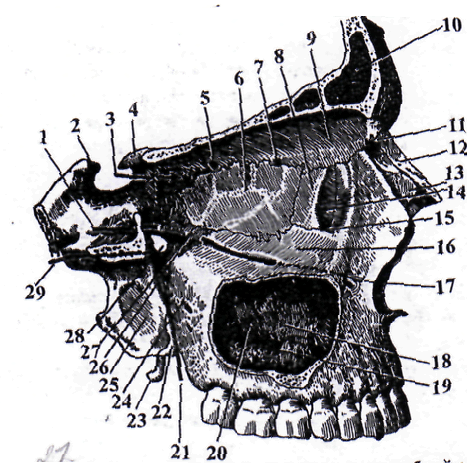 1 – зонд в for. rotundum; 2 – dorsum sellae; 3 – зонд в canalis opticus; 4 – sulcus prechiasmatis; 5 – for. ethmoidale posterius; 6 – lamina orbitalis ossis ethmoidalis; 7 – for. ethmoidale anterius; 8 – os lacrimale; 9 – os frontale; 10 – sinus frontalis; 11 – sutura nasofrontalis; 12 – os nasale; 13 – vomer; 14 – sulcus nasolacrimalis; 15 – canalis nasolacrimalis; 16 – facies orbitalis maxillae; 17 – зонд в canalis infraorbitalis; 18 – concha nasalis inferior; 19 – sinus maxillaris; 20 – lamina perpendicularis ossis palatini; 21 – зонд в canalis palatinus major; 22 – processus pyramidalis ossis palatini; 23 – hamulus pterygoideus; 24 – tuber maxillae; 25 – lamina lateralis processus pterygoidei; 26 – fossa pterygopalatina; 27 – processus orbitalis ossis palatini; 28 – for. sphenopalatinum, 29 – зонд в canalis pterygoideus.