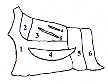 1 – processus frontalis et facies nasalis maxillae; 2 – os lacrimale; 3 – labyrinthus ethmoidalis (a – concha nasalis superior; б – concha nasalis media; 4 – concha nasalis inferior; 5 – lamina perpendicularis ossis palatini; 6 – lamina medialis processus pterygoidei ossis sphenoidalis.