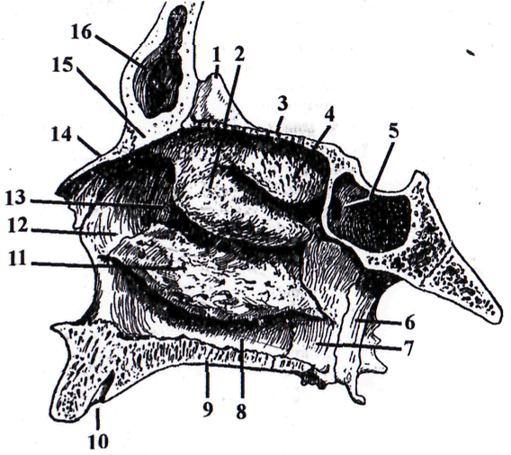 1 – crista galli; 2 – concha nasalis media; 3 – lamina cribrosa; 4 – concha nasalis superior; 5 – apertura sinus sphenoidalis; 6 – lamina medialis processus pterygoidei; 7 – lamina perpendicularis ossis palatini; 8 – meatus nasi inferior; 9 – palatum osseum; 10 – canalis incisivus; 11 – concha nasalis inferior; 12 – processus frontalis maxillae; 13 – os lacrimale; 14 – os nasale; 15 – os frontale; 16 – sinus frontalis.