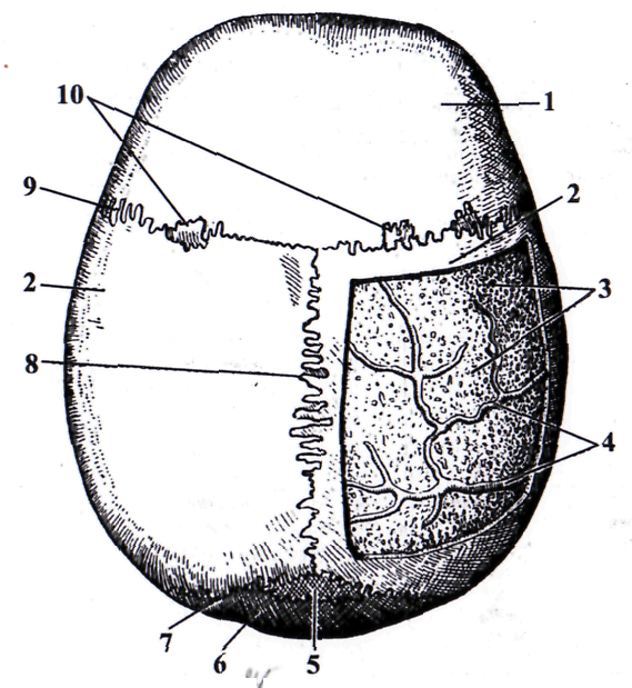 1 – os frontale; 2 – os parietale; 3 – diploë; 4 – venae diploicae; 5 – os intraparietale (Inci); 6 – os occipitale; 7 – sutura lambdoidea; 8 – sutura sagittalis; 9 – sutura coronalis; 10 – ossa suturata.