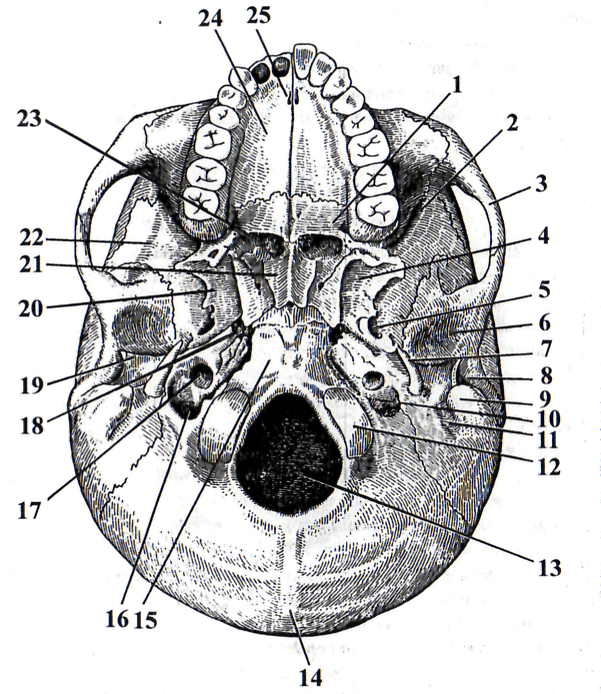 1 – lamina horizontalis ossis palatini; 2 – fossa pterygopalatina; 3 – arcus zygomaticus; 4 – fossa pterygoidea; 5 – for. ovale; 6 – fossa mandibularis; 7 –processus styloideus; 8 – porus acusticus externus; 9 – processus mastoideus; 10 –fissura petrooccipitalis; 11 – incisura mastoidea; 12 – condylus occipitalis; 13 – for. magnum; 14 – crista occipitalis externa; 15 – pars basilaris ossis occipitalis; 16 – for. jugulare; 17 – for. caroticum externum; 18 – for. lacerum; 19 – pars tympanica ossis temporalis; 20 – processus pterygoideus; 21 – vomer; 22 – ala major ossis sphenoidalis; 23 – choana; 24 – processus palatinus maxillae; 25 – canalis incisivus.