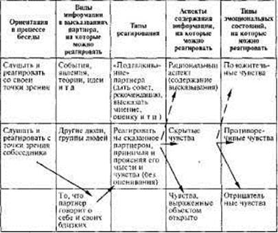 Рисунок 1 Избирательный процесс слушания и реагирования при использовании техники понимающего общения Стрелками обозначены возможные вариант ы noHUvmroLuero реагирования на высказывания собеседника сплошными — бочее сильные, пунктирными — менее сильные по своему психологическому эффекту