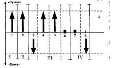 Примечание- черная стрелка обозначает направление изменения показатели в «худшую» или «лучшую» стороны в условиях «присутствия», черный квадратик обозначает незначимые разтичия показателен психической деятельности в условиях изолированного обследования и в условиях «присутствия других»