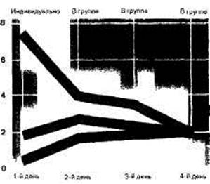 движения неподвижного источника света в темноте) М Шериф обнаружил тенденцию к усреднению, согласованности индивидуальных оценок в группе и их последующее закрепление и воспроизведение в индивидуальных оценках испытуемых (см рис 7) Эти эксперименты положили начало серии лабораторных исследований феноменов группового давления а конформизма