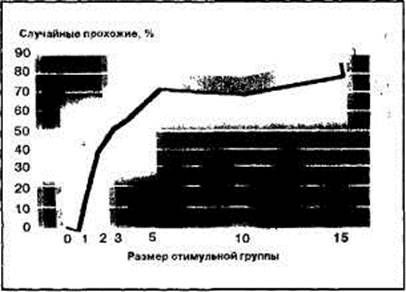 Рис. &'. Рамер группы и конформизм. Процент прохожих, подражающих группе смотревших вверх людей, возрастает при увеличении размера группы от одного до пяти человек. Поданным Milgram, Bickmarui Bcrkowitz. 1969.