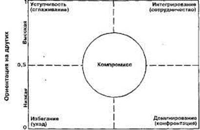«Ориентация на себя» означает степень стремления индивида удовлетворить свои потребности и интересы. «Ориентация на других» означает степень стремления или предрасположенности индивида удовлетворять потребности и ожидания других. Комбинации этих параметров дают 5 конкретных стилей или способов управления конфликтами: интегрирование, доминирование, уступчивость или сглаживание, избегание и компромисс. 1) Интегрирование — высокая ориентация на себя и на других. Этот стиль включает открытость, обмен информацией, выяснение и проверку различий для достижения эффективного решения, приемлемого для обеих сторон. 2) Уступчивость или сглаживание — низкая ориентация на себя и высокая на других. Этот стиль ассоциируется с попытками преуменьшать важность различий и подчеркивать, акцентировать внимание на общности, совладениях, чтобы удовлетворить потребности других, пренеб-pei ая своими собственными интересами. 3) Доминирование - высокая ориентация на себя и низкая на других. Этот стиль идентифицируется с ориентацией «выиграть — проиграть» или с «силовым» поведением, чтобы добиться победы. 4) Избегание — низкая ориентация на себя и на других. Этот стиль ассоциируется с уходом в сторону, удалением себя (психологически или физически) из ситуации конфликта. 5) Компромисс - средняя ориентация на себя и других. Этот стиль включает тактику типа «ты мне — я тебе», т. е. обе стороны что-то теряют, чтобы достичь взаимоприемлемого решения.