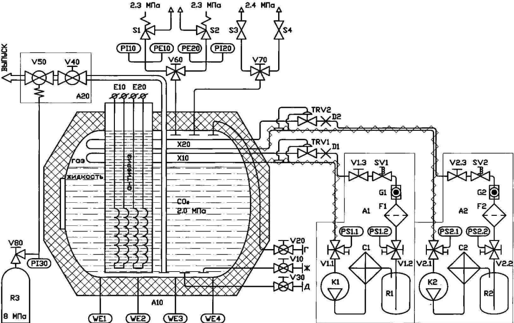 длительное бездренажное хранение ЖУ в резервуаре с давлением 1,95÷2,05 МПа при периодически работающих холодильных агрегатов и электрических нагревателей;