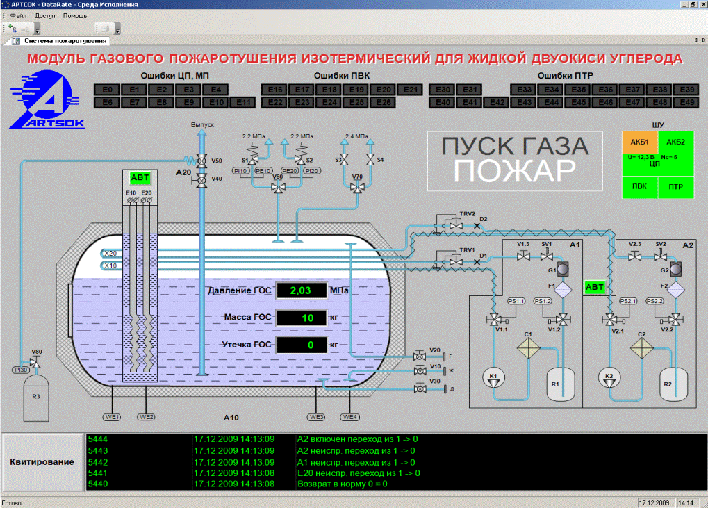 подачу жидкой двуокиси углерода (ЖУ) из резервуара через ЗПУ и систему трубопроводов к насадкам распылителей;