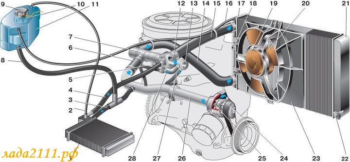 1 – радиатор отопителя; 2 – пароотводящий шланг радиатора отопителя; 3 – шланг отводящий; 4 – шланг подводящий; 5 – датчик температуры охлаждающей жидкости (в головке блока); 6 – шланг подводящей трубы насоса; 7 – термостат; 8 – заправочный шланг; 9 – пробка расширительного бачка; 10 – датчик указателя уровня охлаждающей жидкости; 11 – расширительный бачок; 12 – выпускной патрубок; 13 – жидкостная камера пускового устройства карбюратора; 14 – отводящий шланг радиатора; 15 – подводящий шланг радиатора; 16 – пароотводящий шланг радиатора; 17 – левый бачок радиатора; 18 – датчик включения электровентилятора; 19 – электродвигатель вентилятора; 20 – крыльчатка электровентилятора; 21 – правый бачок радиатора; 22 – сливная пробка; 23 – кожух электровентилятора; 24 – зубчатый ремень привода механизма газораспределения; 25 – крыльчатка насоса охлаждающей жидкости; 26 – подводящая труба насоса охлаждающей жидкости; 27 – подводящий шланг к жидкостной камере пускового устройства карбюратора