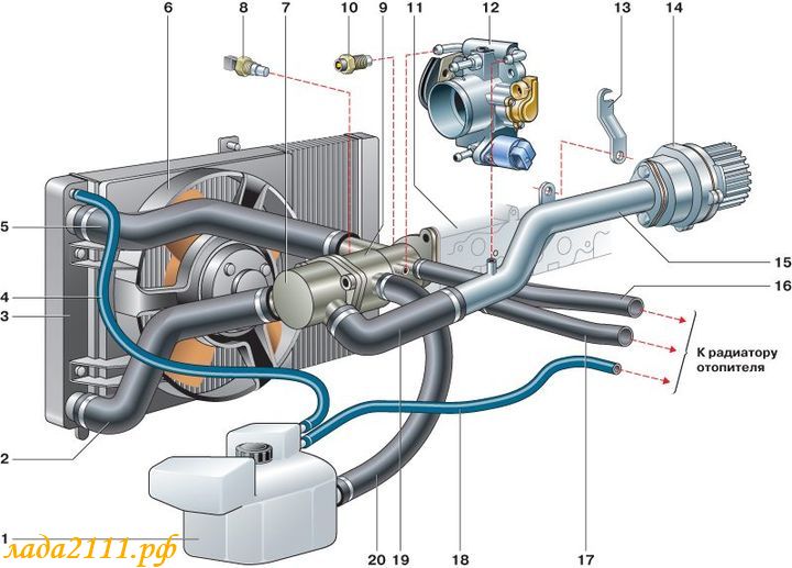 1 – расширительный бачок;2 – отводящий шланг радиатора; 3 – радиатор; 4 – пароотводящий шланг радиатора; 5 – подводящий шланг радиатора; 6 – кожух электровентилятора системы охлаждения; 7 – корпус термостата; 8 – датчик температуры охлаждающей жидкости системы управления двигателем (установлен в выпускном патрубке); 9 – выпускной патрубок; 10 – датчик температуры охлаждающей жидкости для комбинации приборов (установлен в головке блока цилиндров); 11 – головка блока цилиндров; 12 – дроссельный узел; 13 – кронштейн крепления подводящей трубы насоса охлаждающей жидкости; 14 – насос охлаждающей жидкости; 15 – подводящая труба насоса охлаждающей жидкости; 16 – подводящий шланг радиатора отопителя; 17 – отводящий шланг радиатора отопителя; 18 – пароотводящий шланг радиатора отопителя; 19 – шланг подводящей трубы насоса охлаждающей жидкости; 20 – заправочный шланг.
