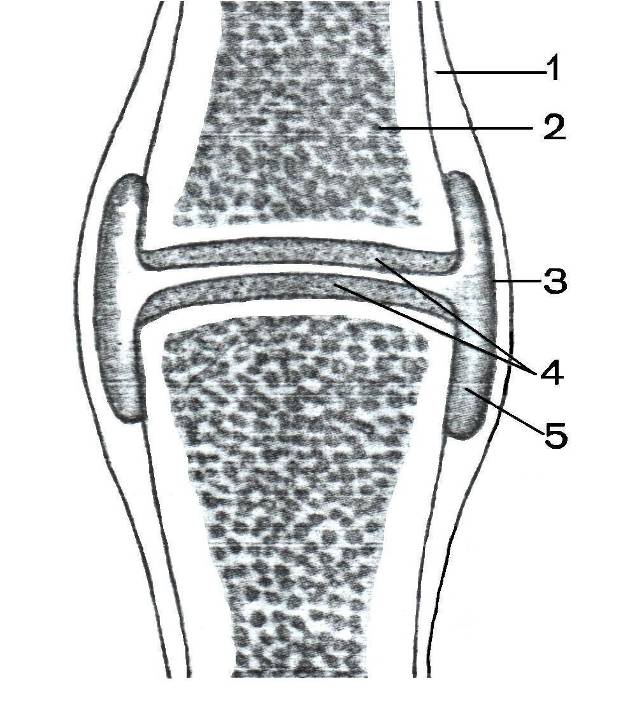 1 – надкостница; 2 – кость; 3 – суставная капсула; 4 – суставные поверхности, покрытые суставным хрящом; 5 – суставная полость.