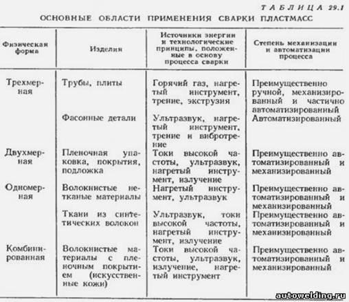 Области применения видов сварки в зависимости от физической формы полимера и вида изделий приведены в табл. 29.1.