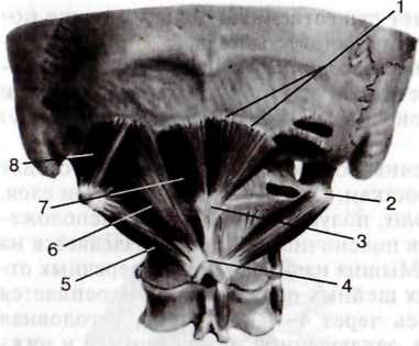 1 — linea nuchae inferior; 2 — processus transversus atlantis;3 — tuberculum posterius atlantis; 4 — processus spinosus axis; 5 — m. obliquus capitis inferior;6 — m. rectus capitis posterior major; 7 — m. rectus capitis posterior minor; 8 — m. obliquus capitis superior.