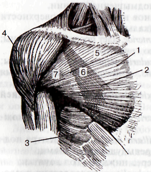 1 - m. pecloralis major; 2 - m. peсtoralis minor (проекция); 3 - т. serratus anterior; 4 - т. deltoideus;5 - trigonum clavipectorale; 6 - trigonum pectorale;7 – trigonum subpectorale.