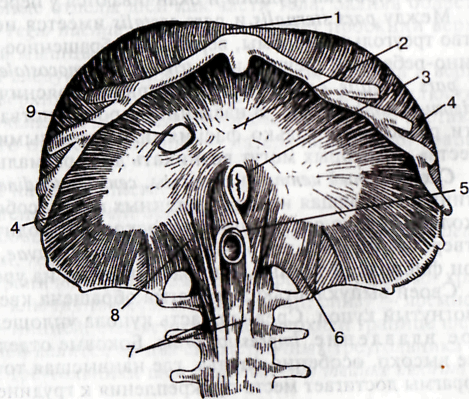 1 — pars sternalis: 2 — centrum tendineum; 3 — hiatus esophageus; 4 — pars costalis; 5 — hiatus aorticus; 6 — crus laterale; 7 — crus mediale; 8 — crus intermedium; 9 — foramen v. cavae