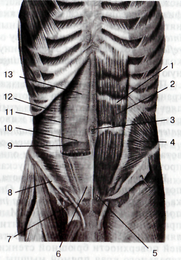 1 — intersectio tendinea; 2 — m. rectus abdominis; 3 — umbo; 4 — m. obliquus internus abdominis; 5 — m. pyramidalis; 6 — vagina m. recti abdominis (передняя стенка); 7 — funiculus spermaticus; 8 — ligamentum inguinale; 9 — fascia transversalis; 10 — linea arcuata; 11 — linea semilunaris; 12 — m. transversus abdominis; 13 — vagina m. recti abdominis (задняя стенка)