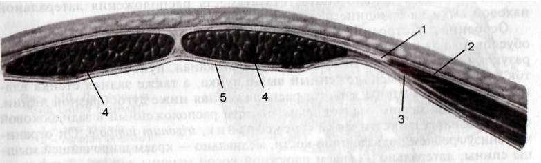 1 — aponeurosis т. obliqui interni abdominis; 2 — aponeurosis m. obliqui externi abdominis; 3 — aponeurosis m. transversi abdominis; 4 — m. rectus abdominis; 5 — fascia transversalis