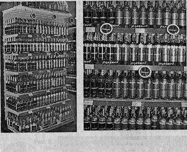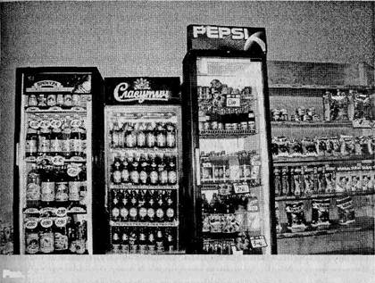 Как разновидность дисплея могут рассматриваться «говорящие полки» (шелфтолкеры) — марочные товары, выложенные отдельно от остальных на тех же стеллажах с яркими указателями их местоположения. Иногда в том же качестве может выступить фирменная витрина или даже охлаждаемые демонстрационные шкафы. Примером может служить оборудование фирм, производящих безалкогольные напитки, широко используемое в крупных магазинах (рис. 2.20).