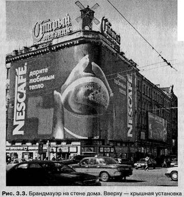 Основными носителями наружной рекламы следует назвать рекламные щиты (англ. billboard), вывески на остановках {bus sheltof), электронно-механические щиты с периодически сменяющимися изображениями (prismavision), световые короба (city light), световые короба на опоре (city light on pole), стационарные панно на зданиях — брандмауэры, крышные установки (рис. 3.3), пространственные конструкции (например огром-
