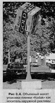 ные объемные макеты: упаковки пленки «Kodak» (рис. 3.4), бутылки «Coca-Cola», пачки сигарет «Marlboro» и т. п.), транспаранты-растяжки, баннеры (от англ. banner — знамя, стяг), декоративные отдельно стоящие уличные часы, кинематические установки (движущиеся от ветра или с вращательным механизмом), «бегущую строку» и др.