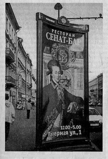 Еще одна тенденция — расширение использования в рекламных целях городских указателей, на которых может быть нанесена информация о рекламодателе (например указатель месторасположения) с обязательным присутствием так называемого городского модуля (содержащего название близлежащей улицы). Актуальность проблемы стала причиной разработки в Москве Городской программы указателей (см.: [100, с. 28-29]). Рекламный контакт достигается во время передвижения получателей по городским улицам и автострадам и поэтому является очень коротким. В связи с этим обращение должно быть лаконичным, тексты — краткими, а изображения — привлекающими непроизвольное внимание и выразительными по форме. При этом важную роль при восприятии этого средства рекламы играют такие параметры, как угол зрения, точка обзора (в прямом смысле этих понятий), высота размещения носителей «наружки».