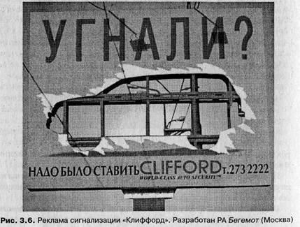 Высокий уровень воздействия на аудиторию достигается за счет зрелищности наружной рекламы и долговременное™ ее демонстрации. Кроме того, могут быть использованы нетрадиционные ходы. Например, стал уже хрестоматийным биллборд московского РА Бегемот: «Украли? Надо было ставить "Клиффорд"!» (рис. 3.6).
