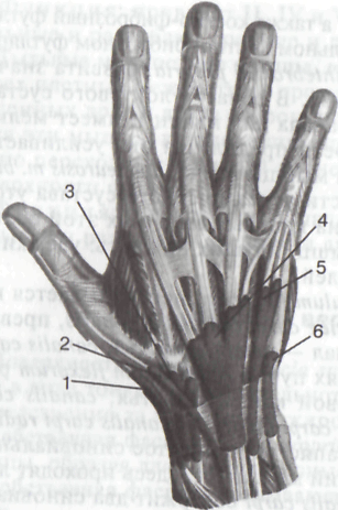 2. Удерживатель разгибателей, retinaculum extensorum, формирует шесть костно-фиброзных каналов, в которых проходят (от латерального края запястья к медиальному):