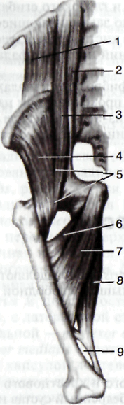II – наружные мышцы таза: большая, средняя и малая ягодичные мышцы, квадратная мышца бедра, верхняя и нижняя близнецовые мышцы, мышца, напрягающая широкую фасцию бедра, наружная запирательная мышца.
